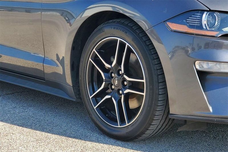 Sporty Design: 18'' machined-face aluminum wheels, a sleek gray metallic exterior, and a body-color bumper enhance the Mustang's aggressive yet refined look.