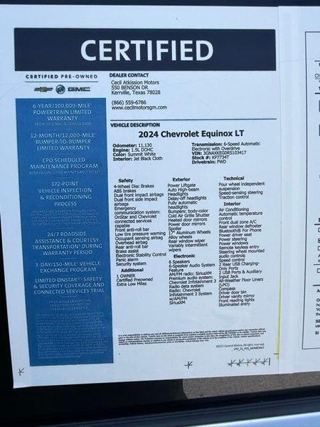 Summit White 2024 Chevrolet Equinox LT FWD 6-Speed Automatic Electronic with Overdrive 1.5L DOHC 1 OWNER, Extra Low Miles, 2-Way Power Driver Lumbar Control Seat Adjuster, All-Weather Floor Liners (LPO), Bluetooth For Phone, Driver 8-Way Power Seat Adjuster, Floor Liner Package (LPO), Heated Driver & Front Passenger Seats, Integrated Cargo Liner (LPO), Power driver seat, Power Liftgate, Preferred Equipment Group 1LT, SiriusXM, Steering wheel mounted audio controls.