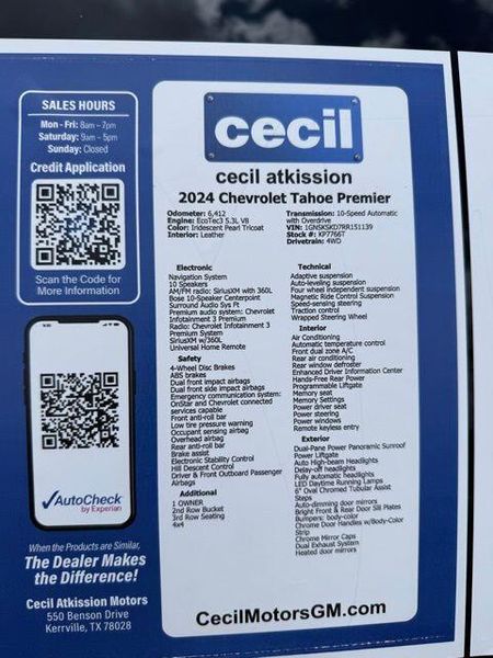 Iridescent Pearl Tricoat 2024 Chevrolet Tahoe Premier 4WD 10-Speed Automatic with Overdrive EcoTec3 5.3L V8 1 OWNER, 2nd Row Bucket, 3rd Row Seating, 4x4, 4WD, Black Leather, 10 Speakers, 1st & 2nd Row Color-Keyed Carpeted Floor Mats, 2-Speed Active Electronic AutoTrac Transfer Case, 3rd Row 60/40 Power-Folding Split-Bench Seat, 3rd row seats: split-bench, Air Conditioning, AM/FM radio: SiriusXM with 360L, Auto-Dimming Inside Rear-View Mirror, Automatic temperature control, Bose 10-Speaker Centerpoint Surround Audio Sys Ft, Bright Front & Rear Door Sill Plates, Chrome Door Handles w/Body-Color Strip, Chrome Mirror Caps, Color-Keyed Carpeting Floor Covering, Driver & Front Outboard Passenger Airbags, Dual Exhaust System, Dual-Pane Power Panoramic Sunroof, Enhanced Driver Information Center, Floor Console, Front dual zone A/C, Hands-Free Rear Power Programmable Liftgate, Heated 2nd Row Outboard Seats, Heated Steering Wheel, Hill Descent Control, Lane Change Alert w/Side Blind Zone Alert, LED Daytime Running Lamps, Memory seat, Memory Settings, Navigation System, Outside Heated Power-Adjustable Mirrors, Power Liftgate, Power Release 2nd Row Bucket Seats, Power Tilt & Telescopic Steering Column, Preferred Equipment Group 1LZ, Rear Cross Traffic Alert, Remote Start, Safety Alert Seat, SiriusXM w/360L, Universal Home Remote, Wireless Charging, Wrapped Steering Wheel.