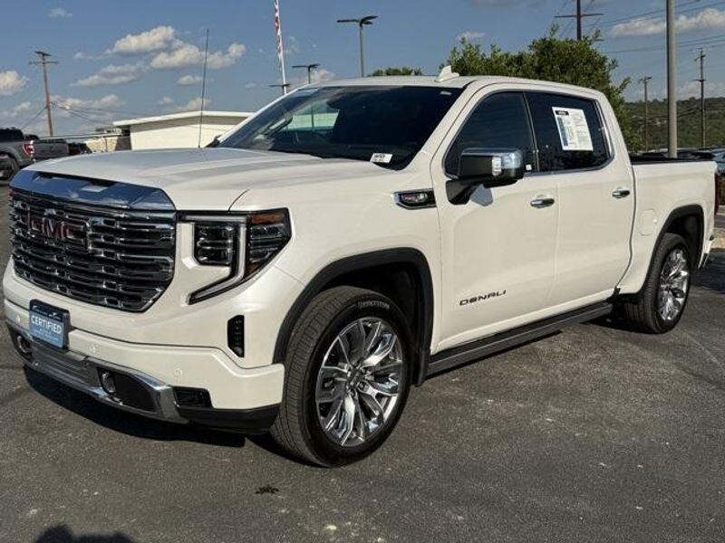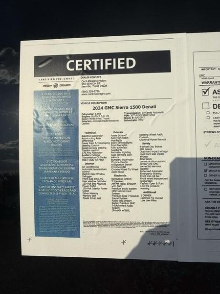 White Frost Tricoat 2024 GMC Sierra 1500 Denali 4WD 10-Speed Automatic EcoTec3 6.2L V8 1 OWNER, Certified Pre Owned, Low Low Miles, 10-Speed Automatic, 4WD, Atmosphere/Brownstone Leather, 12-Way Power Driver Seat Adjuster w/Lumbar, Denali Reserve Package, GMC MultiPro Power Steps, Heated door mirrors, Hitch Guidance, Memory seat, Multicolor 15'' Diagonal Head-Up Display, Navigation System, Power Sunroof, Premium Bose 7-Speaker Sound System, Rear Camera Mirror, Technology Package, Trailering Package, Wheel Locks (Set of 4) (LPO), Wheels: 22'' x 9'' Painted Aluminum.