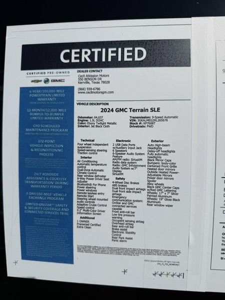 Ebony Twilight Metallic 2024 GMC Terrain SLE FWD 9-Speed Automatic 1.5L DOHC 1 OWNER, Preowned Certified, Extra Clean, 2 USB Data Ports w/Auxiliary Input Jack, 8-Way Power Driver Seat Adjuster, Adaptive Cruise Control, Black GMC Center Caps w/Red GMC Lettering, Black Mirror Caps, Bluetooth For Phone, Darkened Front Grille, Driver & Front Passenger Heated Seats, Driver Convenience Package, Dual-Zone Automatic Climate Control, Elevation Edition, GMC Pro Safety Plus, Lane Change Alert w/Side Blind Zone Alert, License Plate Front Mounting Package, Outside Heated Power-Adjustable Mirrors, Power Driver Lumbar Control, Preferred Equipment Group 3SA, Rear Cross-Traffic Alert, Rear Park Assist, Remote Start, Roof-Mounted Luggage Rack Side Rails, Safety Alert Seat, Wheels: 19'' Gloss Black Aluminum.