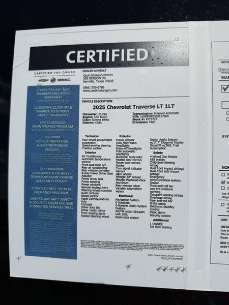Summit White 2025 Chevrolet Traverse LT 1LT FWD 8-Speed Automatic 2.5L DOHC 1 OWNER, 3rd Row Seating, 3rd row seats: split-bench, 4-Way Manual Front Passenger Seat Adjuster, 8-Way Power Driver Seat Adjuster, Apple CarPlay/Android Auto, Navigation System, Power driver seat, Power Liftgate, Preferred Equipment Group 1LT, Remote keyless entry.