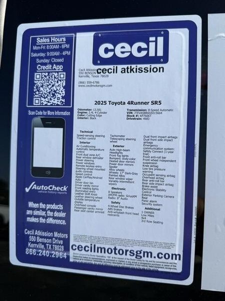 Cutting Edge 2025 Toyota 4Runner SR5 4WD 8-Speed Automatic 2.4L 4-Cylinder 1 OWNER, Low Miles, 4x4, 3rd Row Seating, 4WD, Black, 8 Speakers, ABS brakes, Air Conditioning, Alloy wheels, AM/FM radio: SiriusXM, Electronic Stability Control, Front dual zone A/C, Heated door mirrors, Illuminated entry, Low tire pressure warning, Power steering, Power windows, Radio: 8'' Audio, Remote keyless entry, Steering wheel mounted audio controls, Traction control.