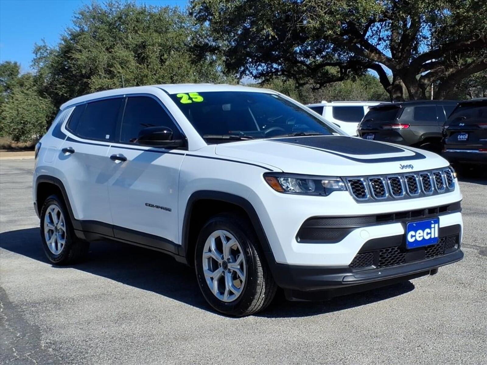 Thank you for visiting another one of Cecil Atkission Uvalde's online listings! Please continue for more information on this 2025 Jeep Compass Sport with 9,083mi. This Jeep includes: ENGINE: 2.0L I4 DOHC DI TURBO W/ESS (STD) 4 Cylinder Engine Gasoline Fuel Turbocharged MOPAR GRAPHICS PACKAGE MOPAR INTERIOR PREMIUM PACKAGE Floor Mats TRANSMISSION: 8-SPEED AUTOMATIC 8F30 (STD) 8-Speed A/T Transmission w/Dual Shift Mode A/T QUICK ORDER PACKAGE 29A BRIGHT WHITE CLEARCOAT *Note - For third party subscriptions or services, please contact the dealer for more information.* If you're in the market for an incredible SUV -- and value on-the-road comfort and manners more than ultimate off-road prowess or tow capacity -- you'll definitely want to check out this Jeep Compass Sport. This wonderfully fuel-efficient vehicle offers a supple ride, quick acceleration and superior styling without sacrificing MPGs. When Jeep created this vehicle with 4 wheel drive, they immediately enhanced the performance ability. Easily switch between two and four wheel drive to take advantage of the improved traction. When the Products are Similar, the Dealer Makes the Difference!